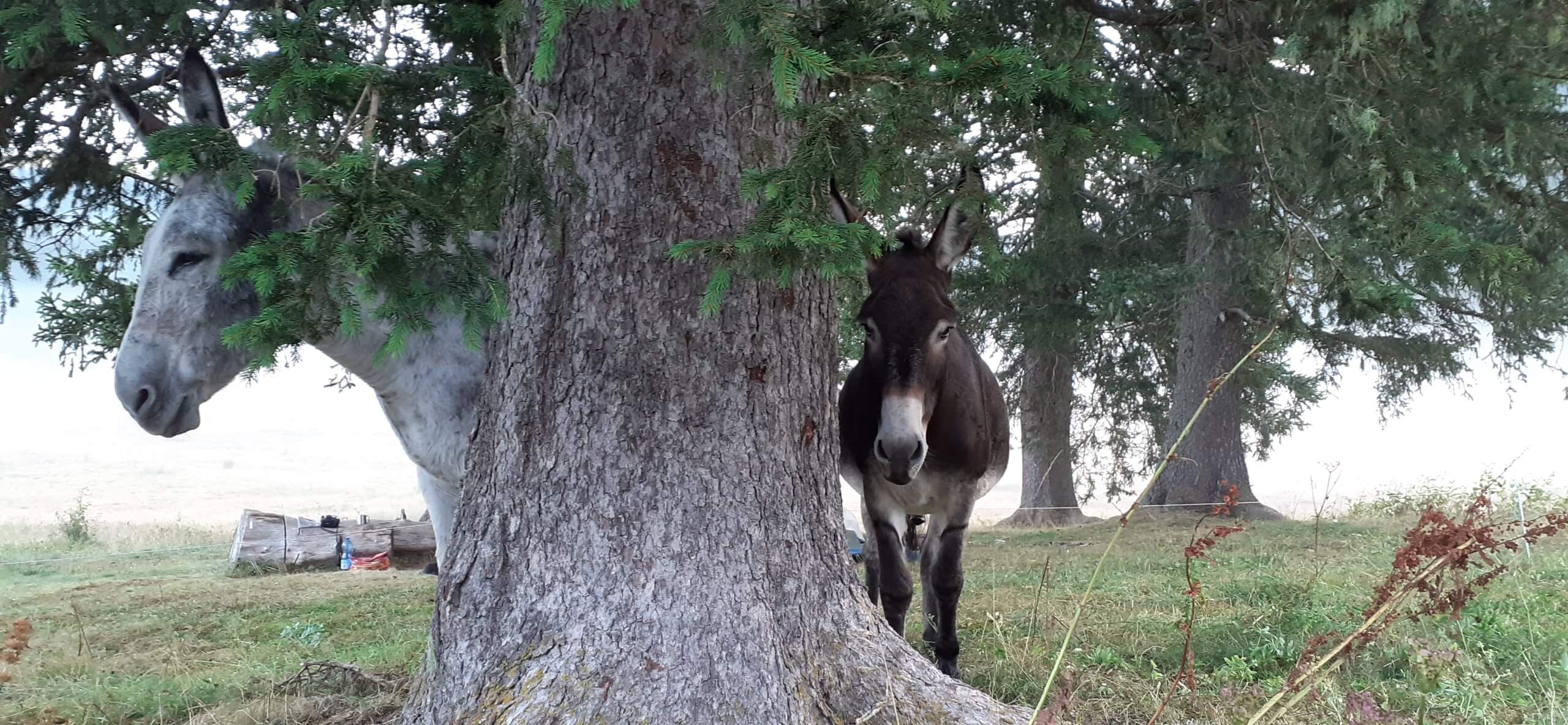 Au-delà de la brume, les premières lueurs. Pour pourvoir aux besoins des animaux, une ration de foin donnée en matinée puis une seconde en fin de journée avant la nuit. La chaleur du soleil viendra apporter du bien-être aux ânes.